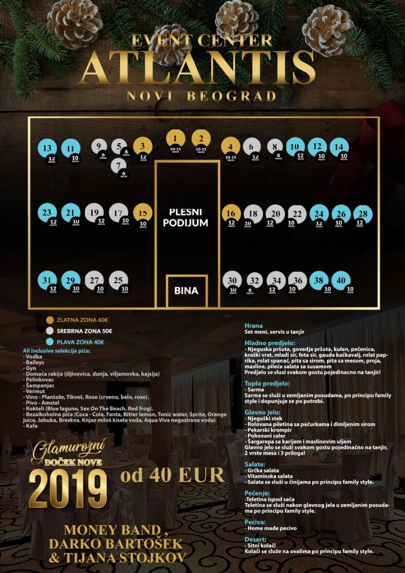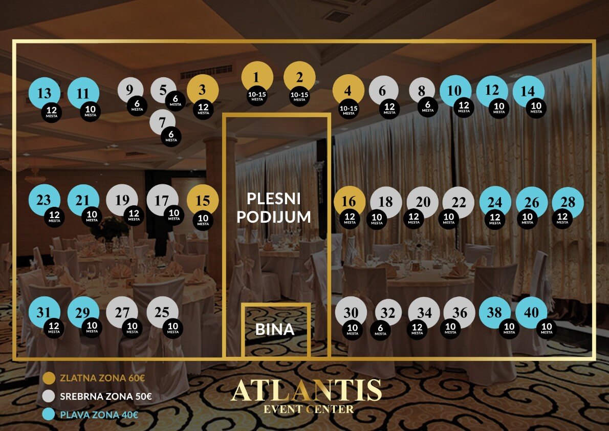 Cena po osobi kreće se od 40€ do 60€ u zavisnosti od pozije stola u sali (pogledati mapu sedenja ispod).