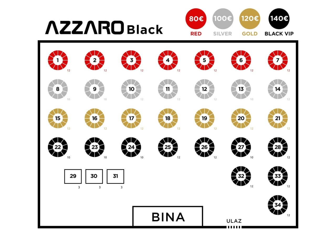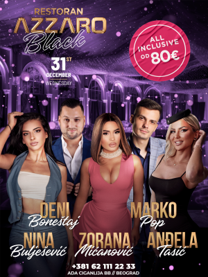 Na već dobro poznatom mestu, na Adi Ciganliji, već dugi niz godina postoje svečane sale Azzaro Black i Azzaro Green koji svake godine organizuje nezaboravan provod povodom dočeka Nove godine. Ni ove godine se dobra tradicija ne prikida, pa će spektakularan provod uz All inclusive ponudu, najukusniju hranu sa bogatog menija i neograničenu konzumaciju domaćih i stranih pića biti deo lude novogodišnje noći.