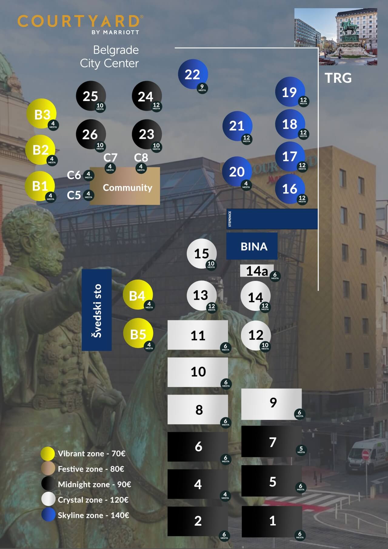 Odabirom Courtyard Marriott Belgrade za Doček Nove godine 2026., birate mesto koje kombinuje sofisticiranost, udobnost i besprekornu uslugu, stvarajući savršeno okruženje za nezaboravan početak nove godine uz najlepši pogled na srce grada, na Trg Republike.