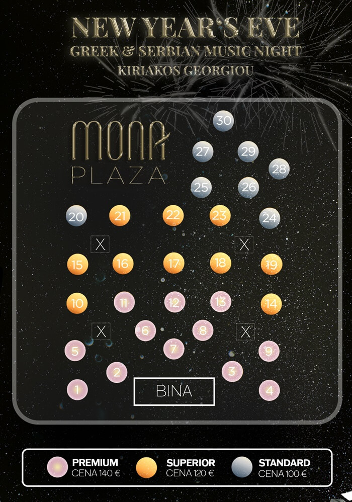 Naoružajte se neiscrpnom energijom, jer ćemo u jeku veselja polomiti po koju čašu, a uz zvuke buzukija i tanjire - sve je dozvoljeno u magičnoj noći, zato ne oklevajte, već budite naš gost, a Mona Plaza će se postarati da opravda Vaša očekivanja. Živeli!
