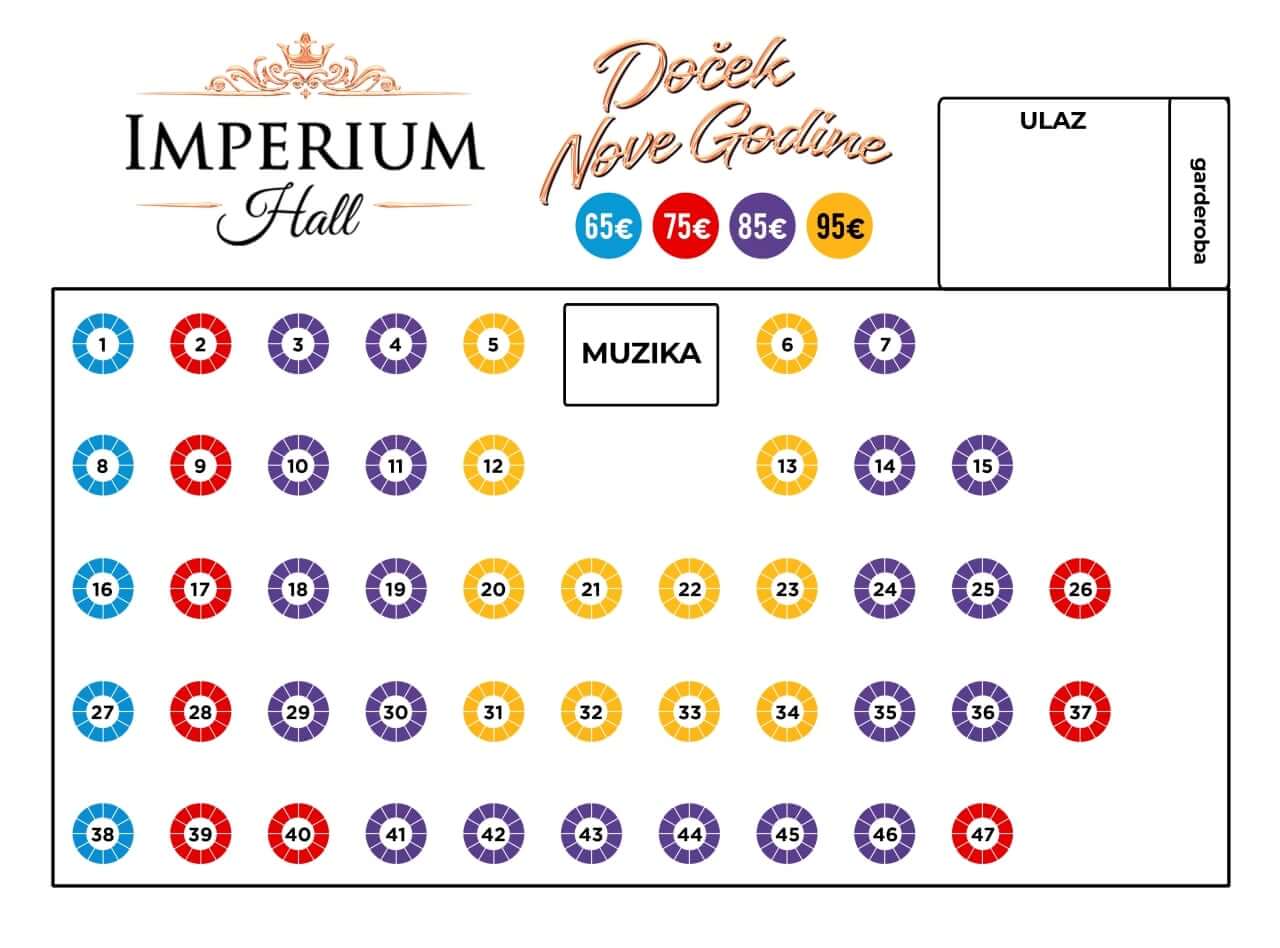 Cena karte po osobi kreće se od 65€ do 95€, u zavisnosti od pozicije stola u sali (pogledajte na mapi ispod).