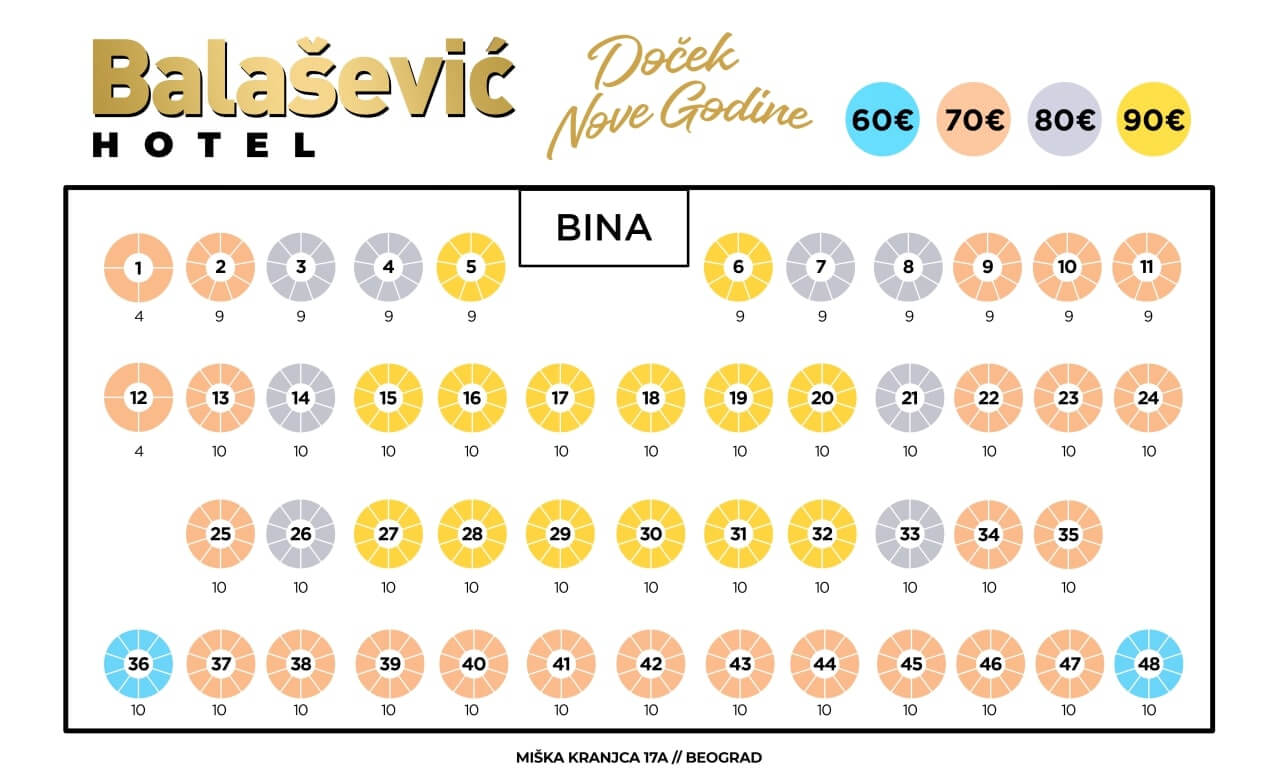 Cena za doček Nove godine u hotelu Balašević kreće se od 60€ do 90€ po osobi, u zavisnosti od pozicije vašeg stola u svečanoj sali (vidi na mapi).