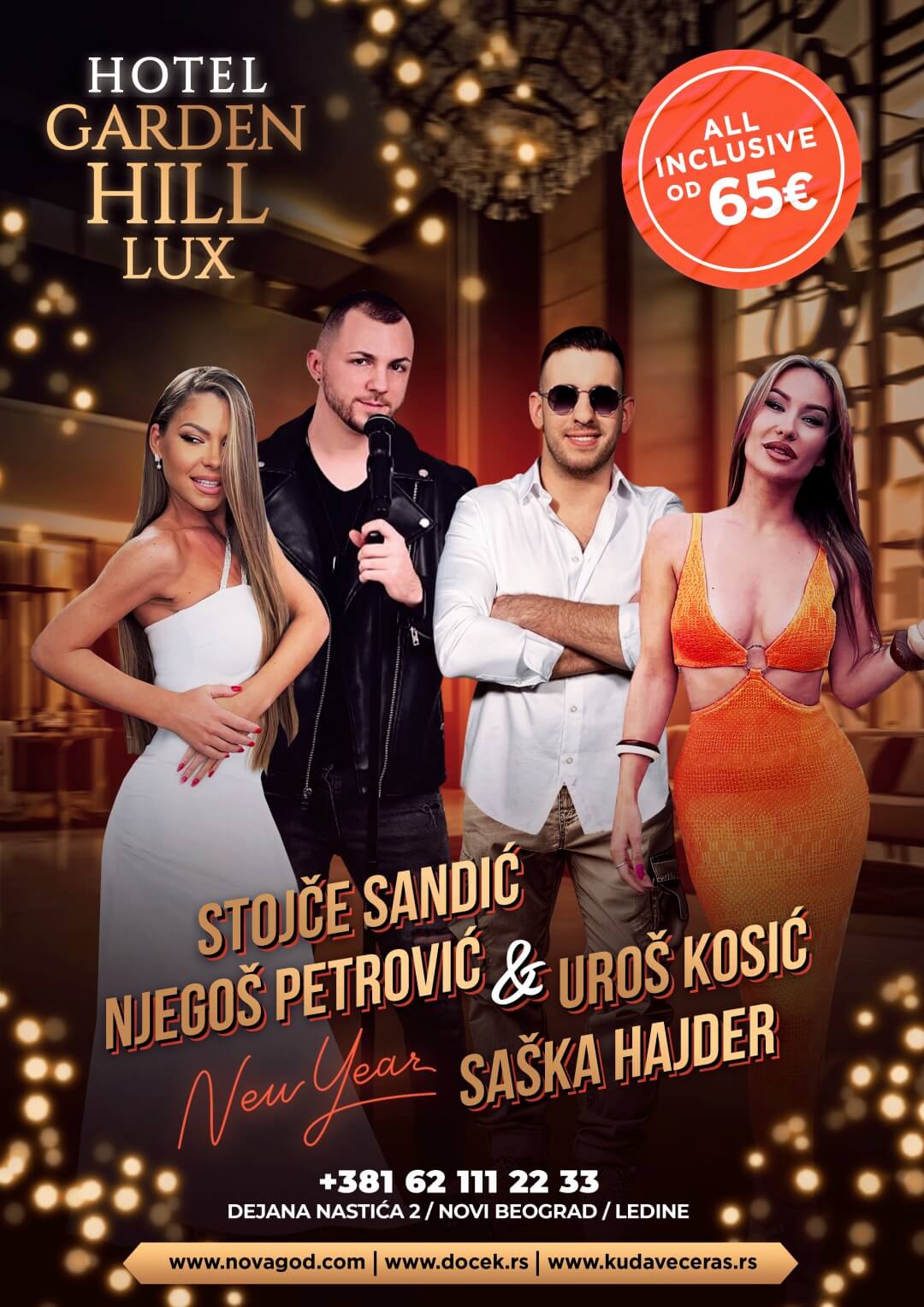 U novogodišnjoj noći ekskluzivnog hotela Garden Hill Lux za sjajnu atmosferu će biti zaduženi fantastični pevači Uroš Kosić, Njegoš Petrović, Stojče Sandić i Saška Hajder.