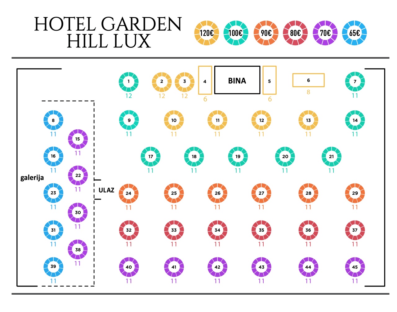 Cena po osobi se kreće od 65€ do 120€ u zavisnosti od pozicije stola u samoj sali i uključuje svečano banket sedenje, neograničenu konzumaciju alkoholnih i bezalkoholnih pića predviđenih ponudom i kompletnu svečanu večeru! (vidi na mapi). U ponudi nemamo barske stolove!