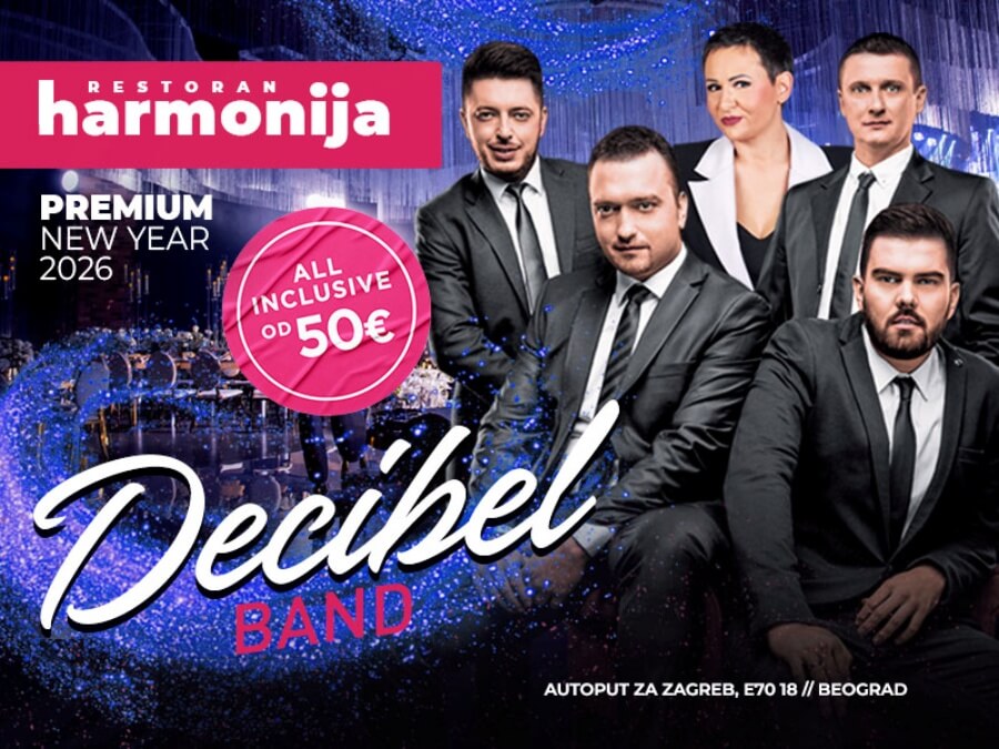Za doček Nove godine u restoranu Harmonija, atmosferu do usijanja podiže Decibel bend - sastav koji čine vrhunski muzičari i izvođači sa bogatim iskustvom. Petočlani bend predvođen fantastičnim vokalima Vlade Krunića i Goce Borković donosi raznovrstan repertoar koji spaja najbolje iz pop, rok, zabavne, strane i narodne muzike.