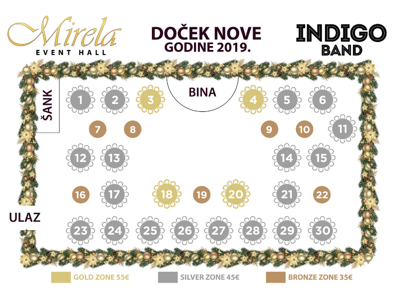 Čitava sala restorana Mirela će biti svečano dekorisana za novogodišnji doček.