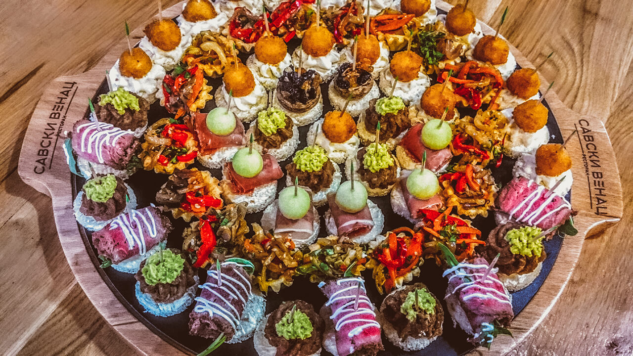 - Svečana večera – ovali na stolu: karađorđeva šnicla, rolovana ćuretina u sosu od blitve, medaljoni u sosu od pečuraka, pekarski krompir, grilovano povrće, rižoto od pečuraka