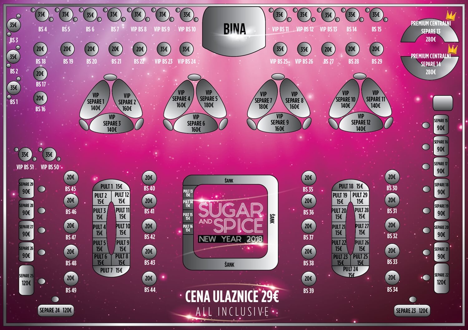 Postoje i VIP separei od 160 € i 180 € jer su blizu bine (pogledaj mapu). - Premium separe za 12-14 osoba - 280 €.