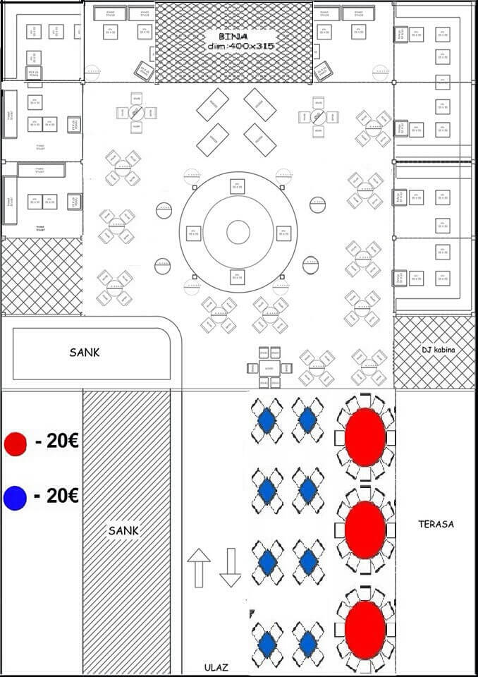 Ukoliko ipak želite da dočekate u klubskom ambijentu, nudimo vam i tu mogućnost. Cena ulaznice je 500 dinara u šta je uključeno piće dobrodošlice: rakija - kajsija, dunja ili šljiva.