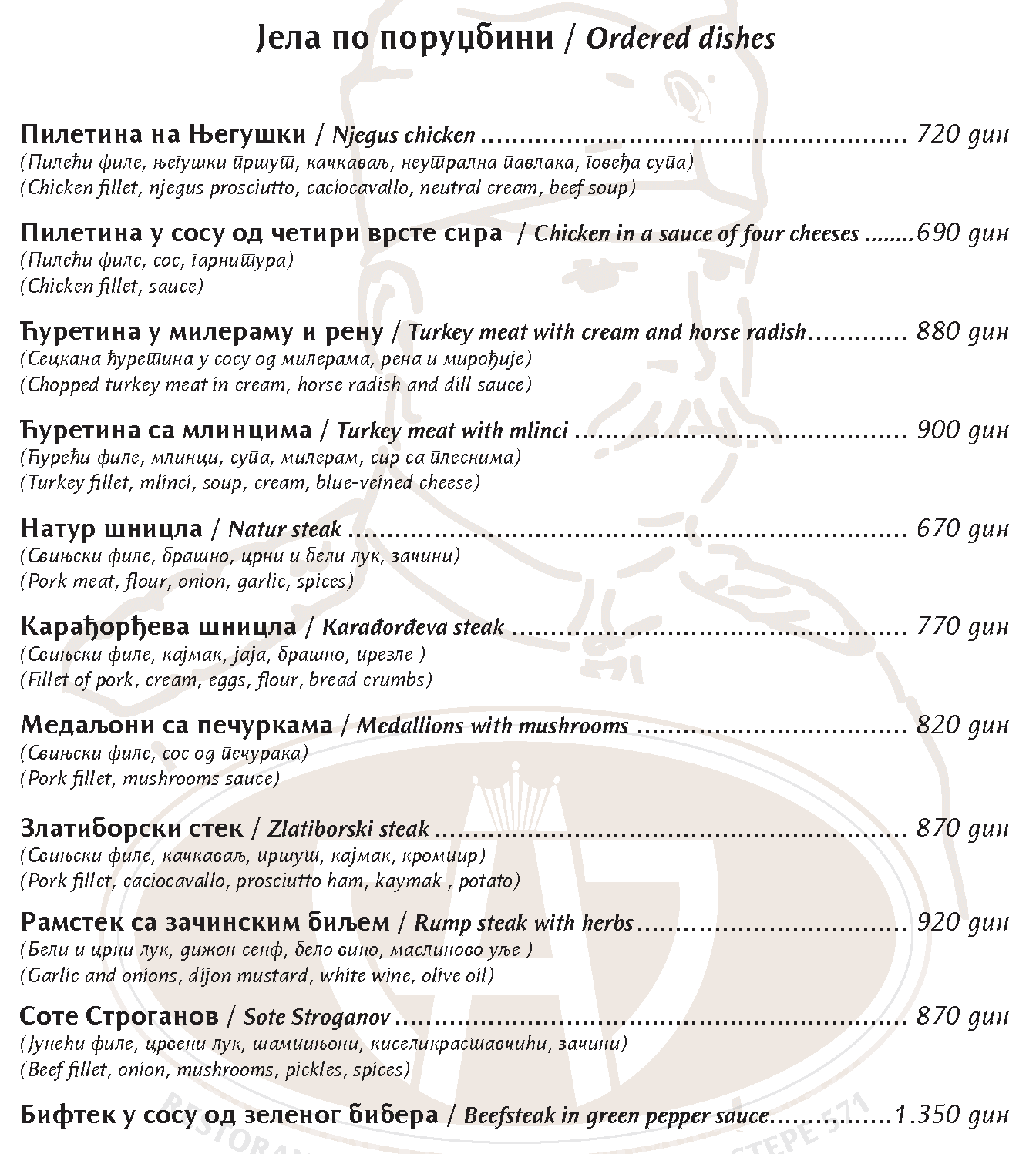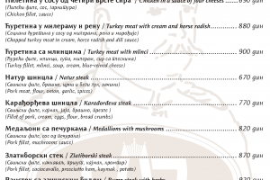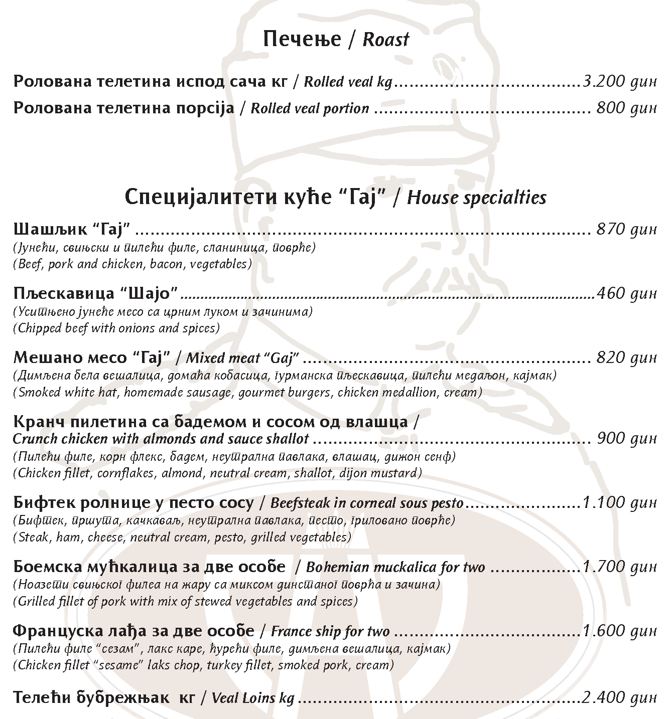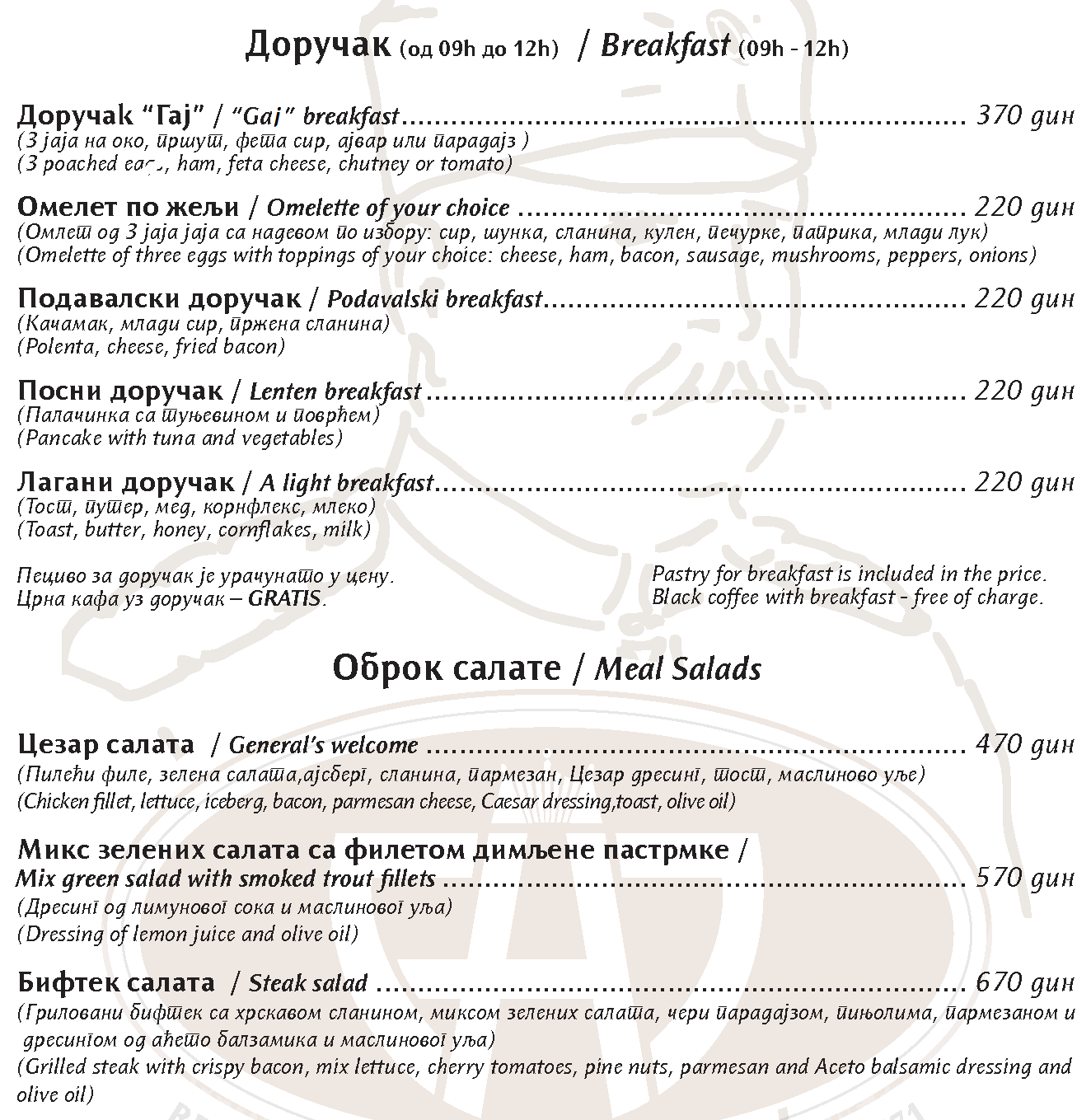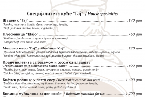 In the beginning, we will present to you an appetizer "Đeneralova dobrodošlica” (General welcome), which is the signature sign of this restaurant and a warm recommendation from the staff. Despite the long list of delicious meals, dishes "Francuska lađa” (Franch boat), "Boemska mućkalica” (Bohemian mixer) and "Teleće brizle” (Veal breast gland) really stand out. For the ladies, restaurant Gaj will recommend you "Ćuretinu sa mlincima” (turkey in special sauce) and "Kranč piletinu” (cranch chicken).