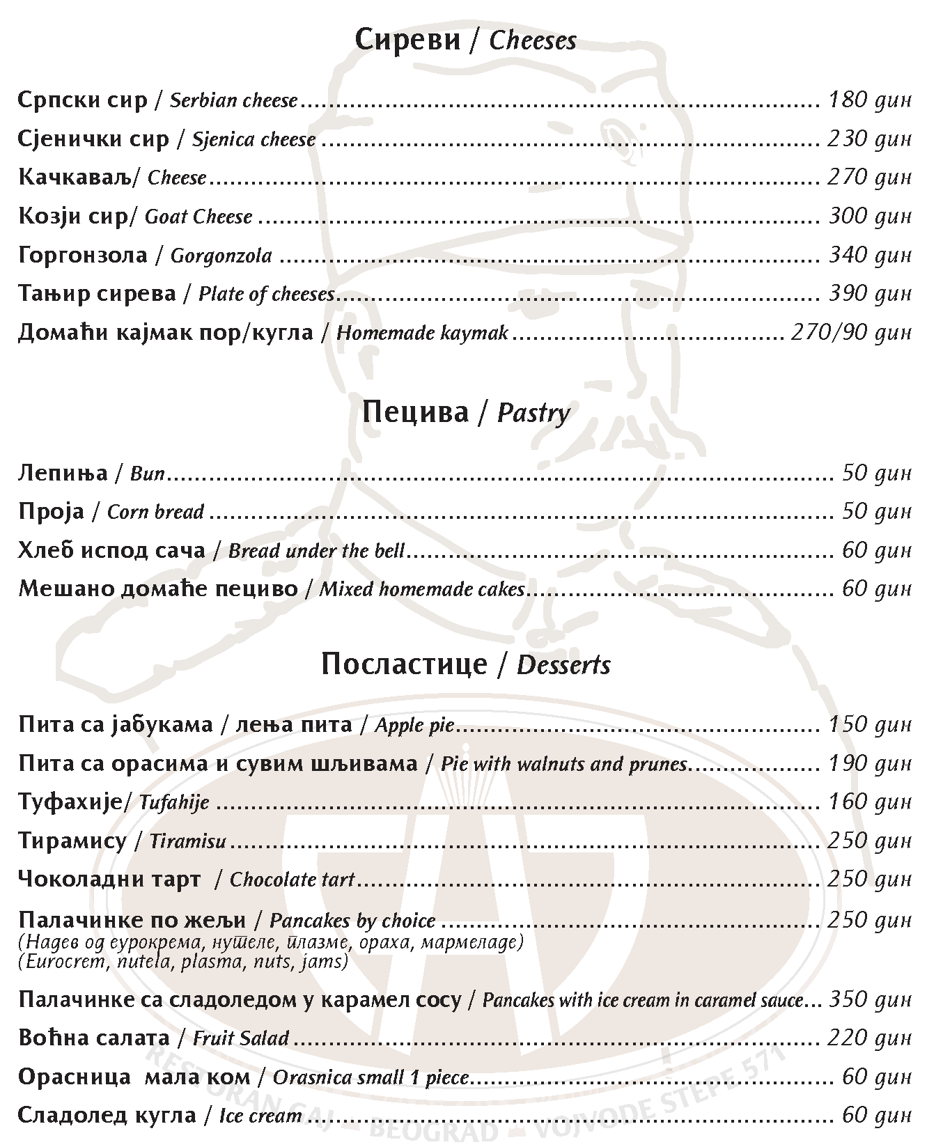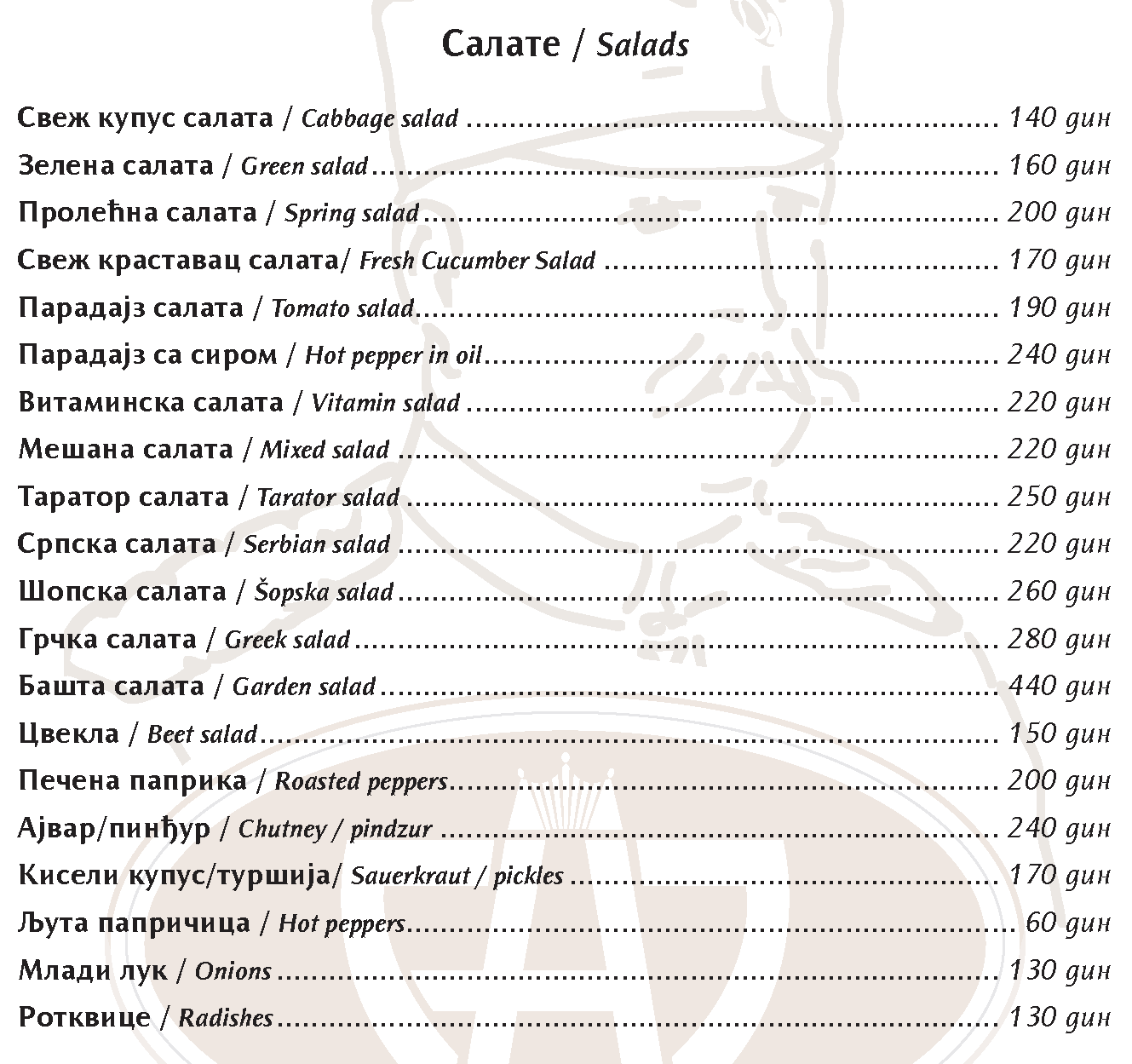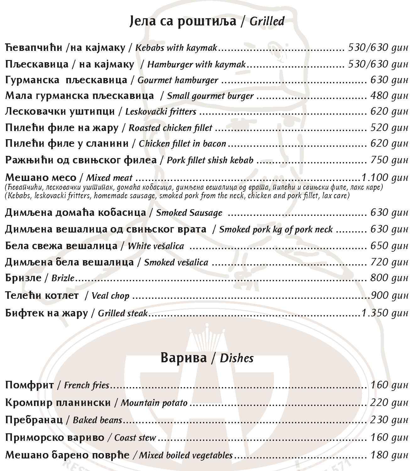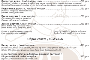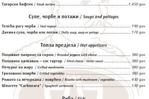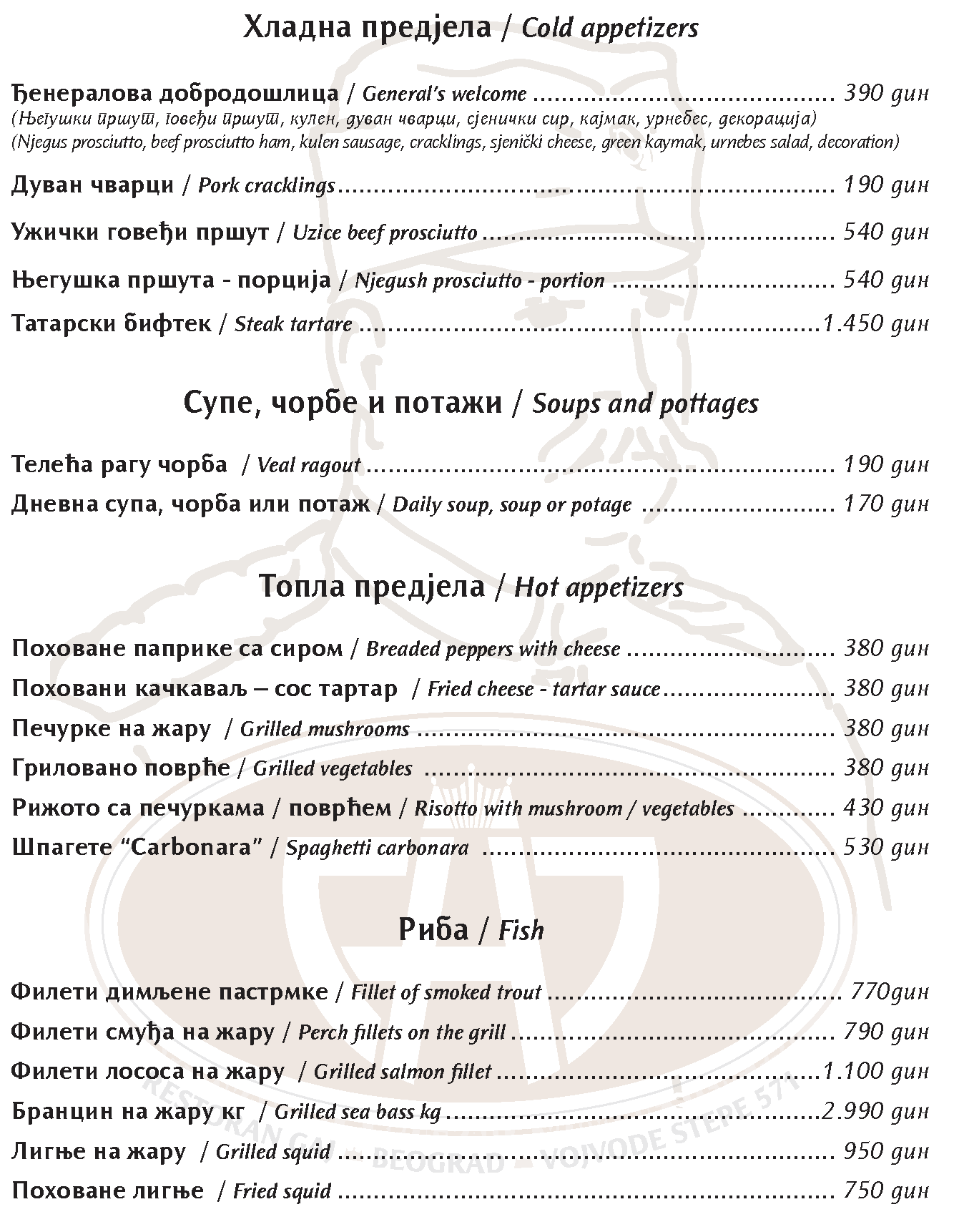 In the beginning, we will present to you an appetizer "Đeneralova dobrodošlica” (General welcome), which is the signature sign of this restaurant and a warm recommendation from the staff. Despite the long list of delicious meals, dishes "Francuska lađa” (Franch boat), "Boemska mućkalica” (Bohemian mixer) and "Teleće brizle” (Veal breast gland) really stand out. For the ladies, restaurant Gaj will recommend you "Ćuretinu sa mlincima” (turkey in special sauce) and "Kranč piletinu” (cranch chicken).