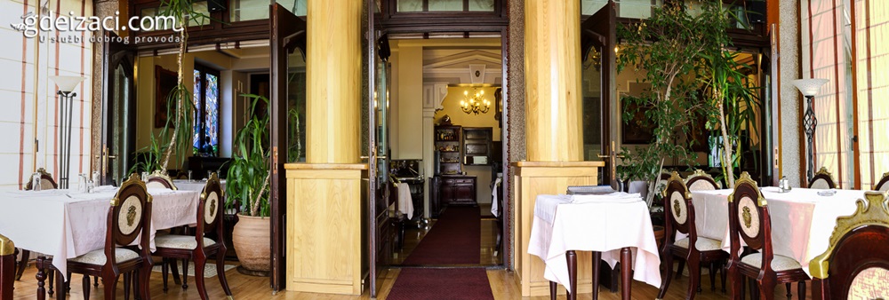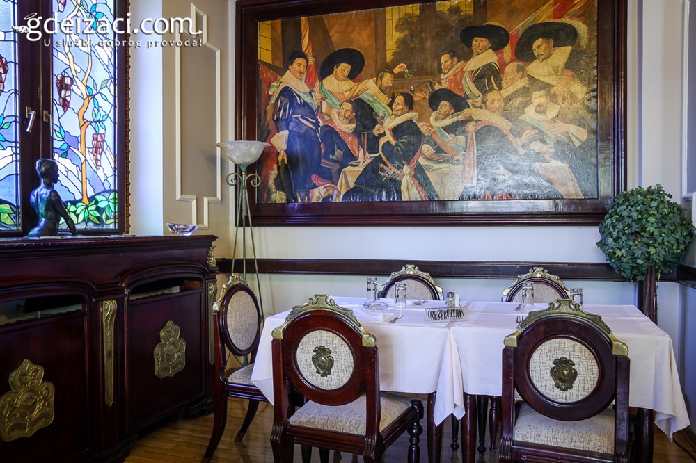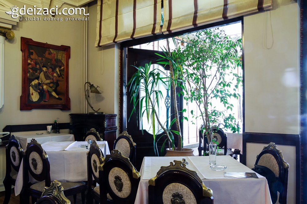 Topao i uglađen enterijer, delo je beogradskog arhitekte Mladena Lisovca zvanog Deni, koji često radi scenografije za filmove. Bogato uređen, pleni kvalitetnom stilskom stolarijom ručne izrade, majstorski izrađenim salonskim stolicama, brojnim slikama među kojima se izdvaja "Večera civilne straže", gipsanim rešenjima, vitražima, draperijama i prijatnom rasvetom.