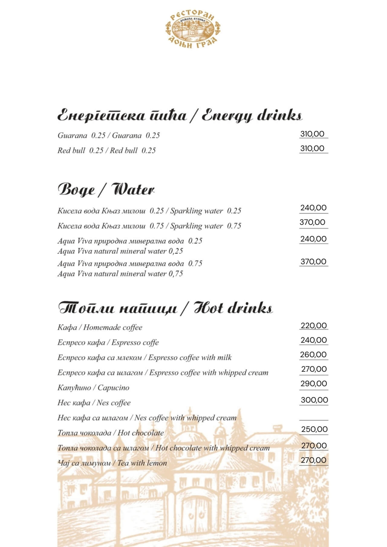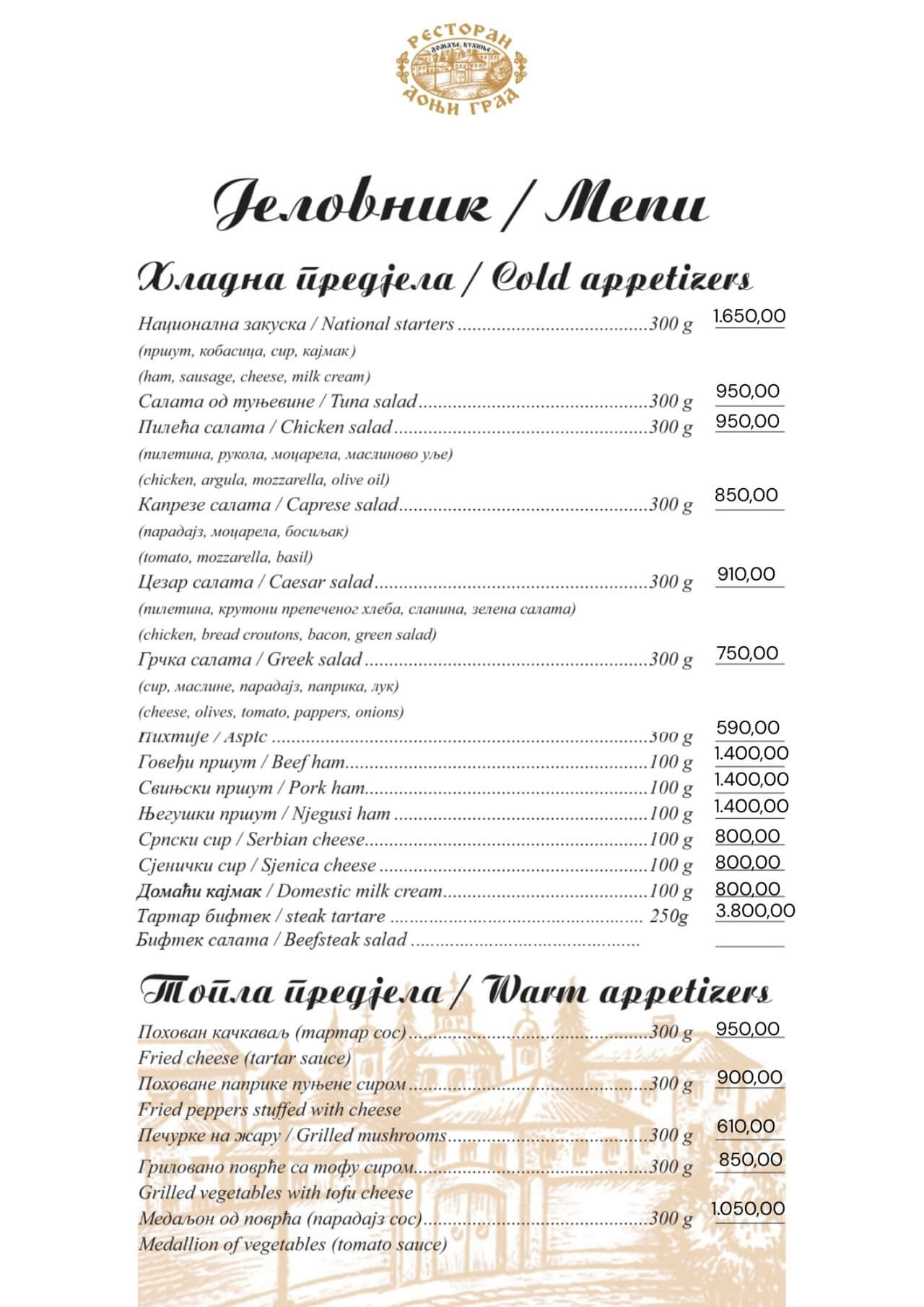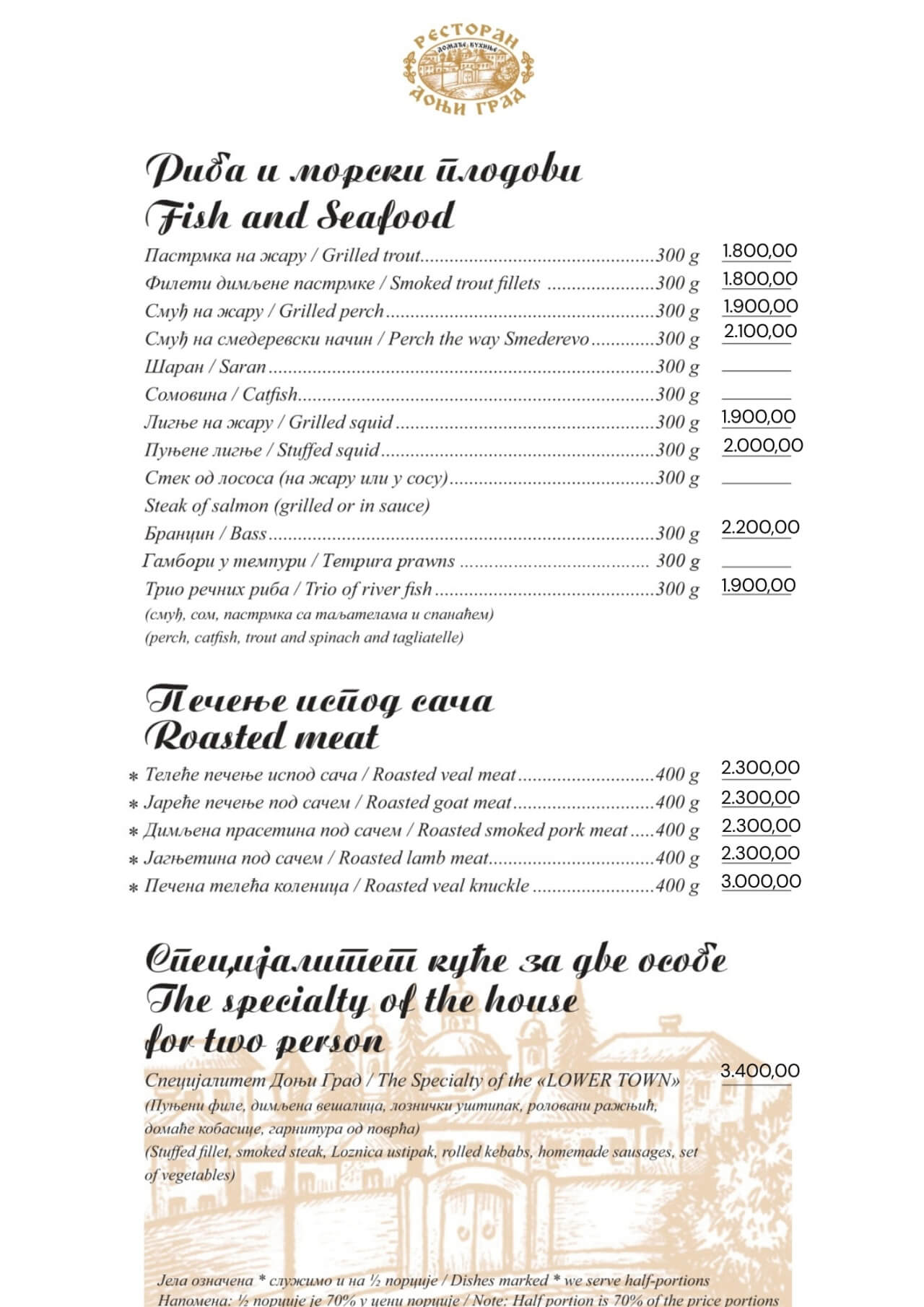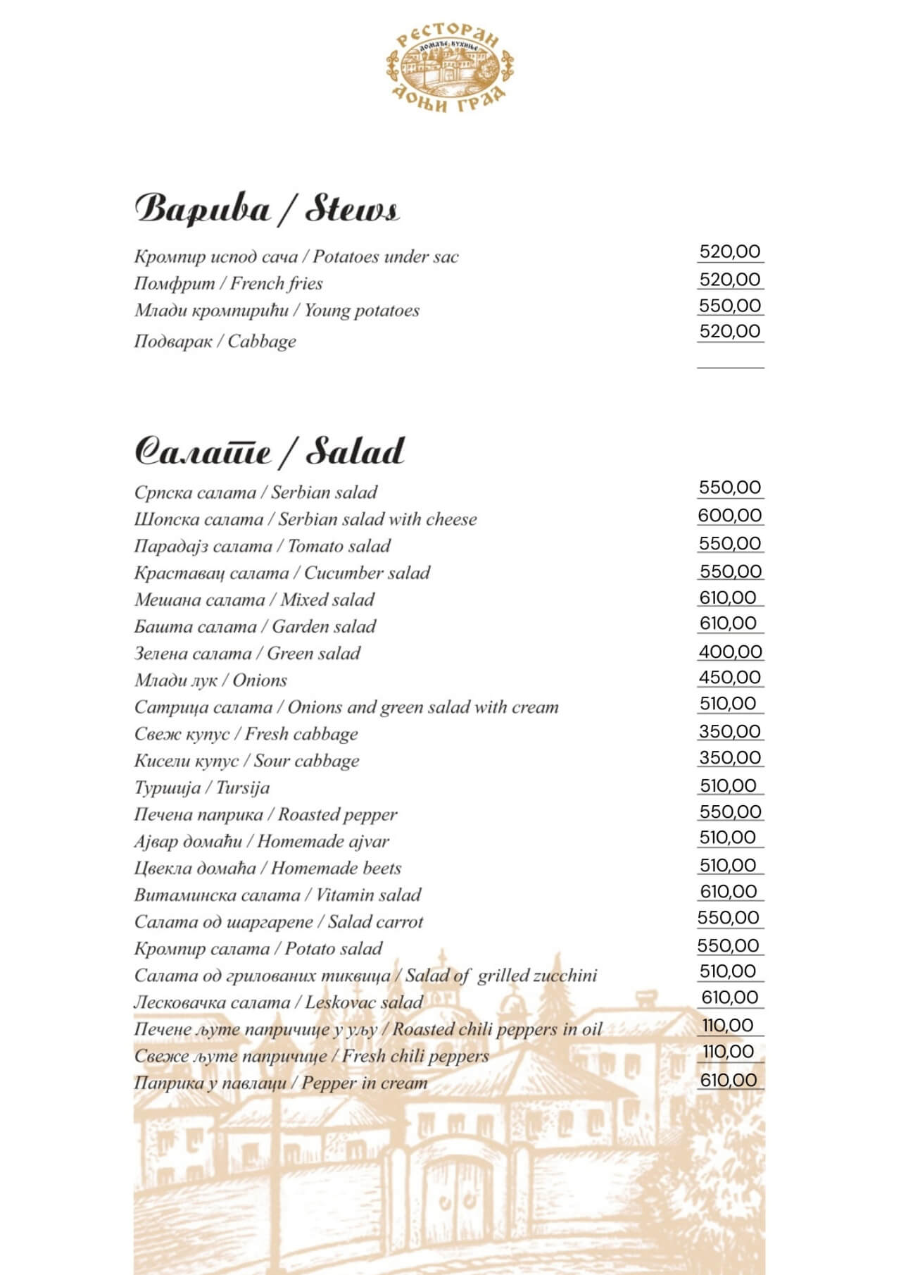 Restoran Donji grad jedno je od onih mesta koja Beograd čine posebnim. Smešten u mirnom delu Dorćola, nedaleko od Kalemegdana, ovaj restoran od 2005. godine spaja duh starog Beograda sa modernim pristupom ugostiteljstvu — stvarajući prostor u kojem se hedonizam i tradicija prirodno prepliću. U Donjem gradu uživaćete u specijalitetima domaće kuhinje pripremljenim po autentičnim receptima: teletini ispod sača, sočnoj jaretini, lozničkoj mućkalici, dimljenoj prasetini, kao i čuvenom bifteku u ulju – jelima zbog kojih se gosti uvek rado vraćaju. Ovde se neguje ukus domaće, tradicionalne kuhinje, ali pripremljen na način koji prati savremene gastronomske standarde.Enterijer od cigle i drveta, topla domaćinska atmosfera i ljubazno osoblje čine Donji grad mestom na kojem se lako osećate kao kod kuće. Letnja bašta pod lipama, koja od proleća do jeseni miriše na pravi beogradski ugođaj, savršena je za jutarnju kafu, opušten ručak ili večeru uz kvalitetno vino.