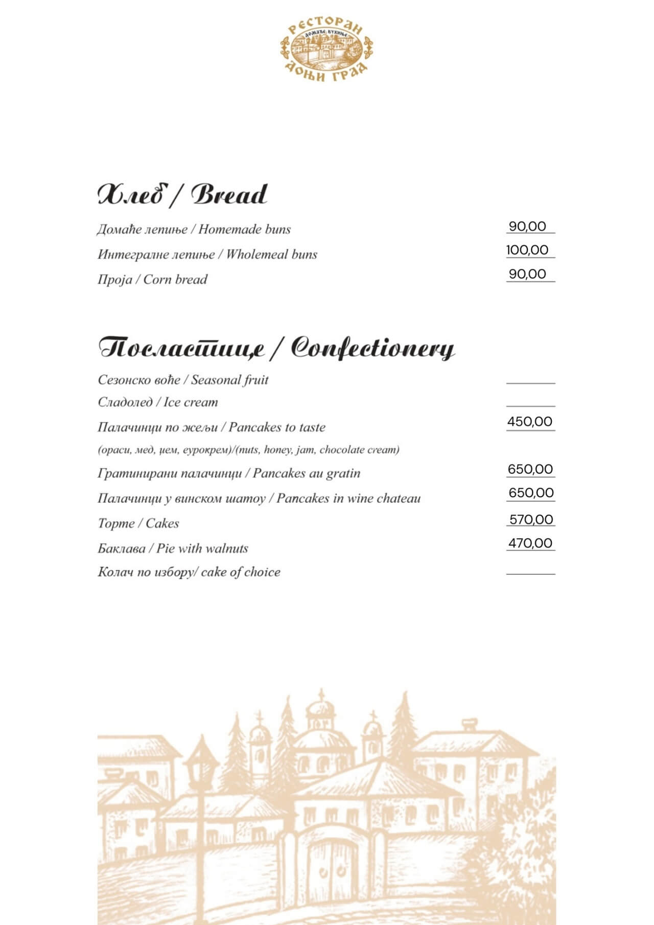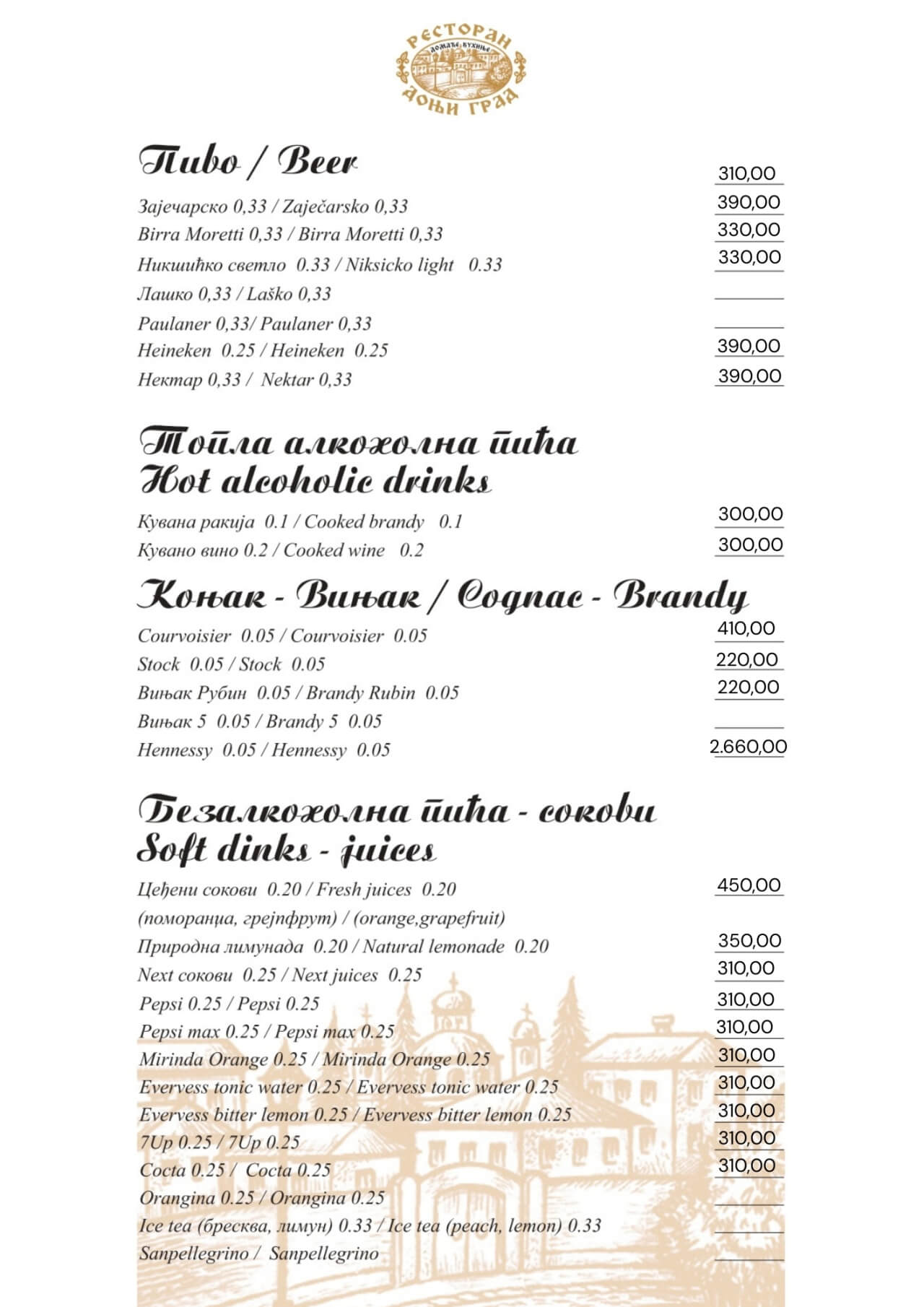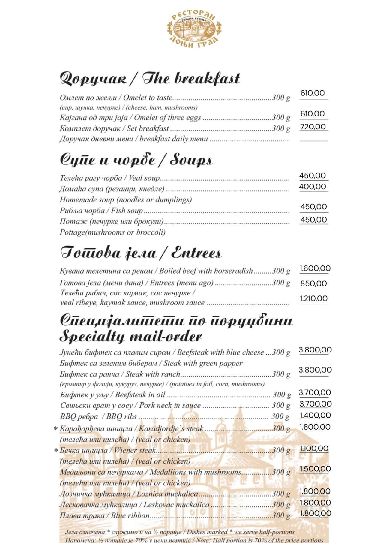Restoran Donji grad jedno je od onih mesta koja Beograd čine posebnim. Smešten u mirnom delu Dorćola, nedaleko od Kalemegdana, ovaj restoran od 2005. godine spaja duh starog Beograda sa modernim pristupom ugostiteljstvu — stvarajući prostor u kojem se hedonizam i tradicija prirodno prepliću. U Donjem gradu uživaćete u specijalitetima domaće kuhinje pripremljenim po autentičnim receptima: teletini ispod sača, sočnoj jaretini, lozničkoj mućkalici, dimljenoj prasetini, kao i čuvenom bifteku u ulju – jelima zbog kojih se gosti uvek rado vraćaju. Ovde se neguje ukus domaće, tradicionalne kuhinje, ali pripremljen na način koji prati savremene gastronomske standarde.Enterijer od cigle i drveta, topla domaćinska atmosfera i ljubazno osoblje čine Donji grad mestom na kojem se lako osećate kao kod kuće. Letnja bašta pod lipama, koja od proleća do jeseni miriše na pravi beogradski ugođaj, savršena je za jutarnju kafu, opušten ručak ili večeru uz kvalitetno vino.