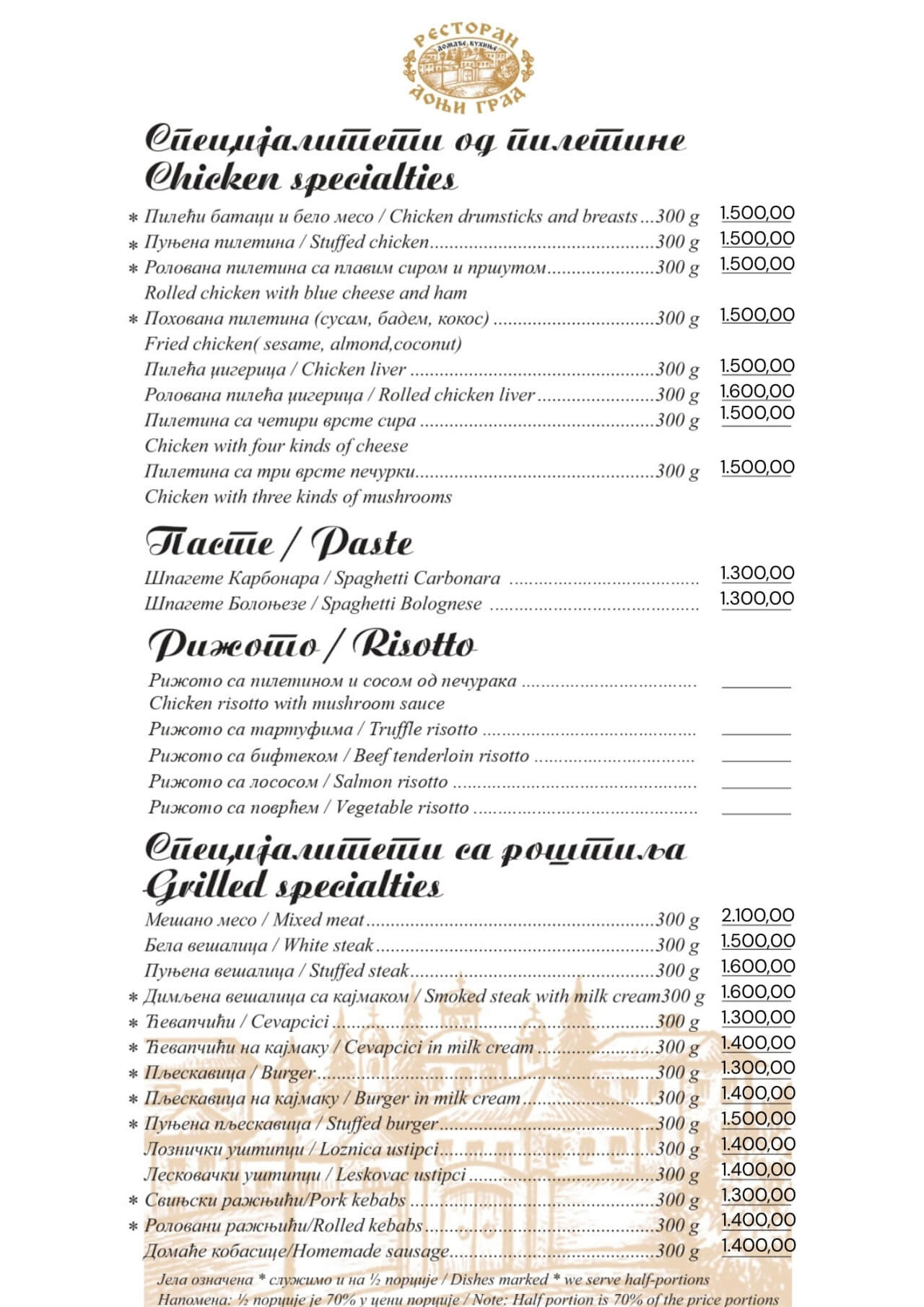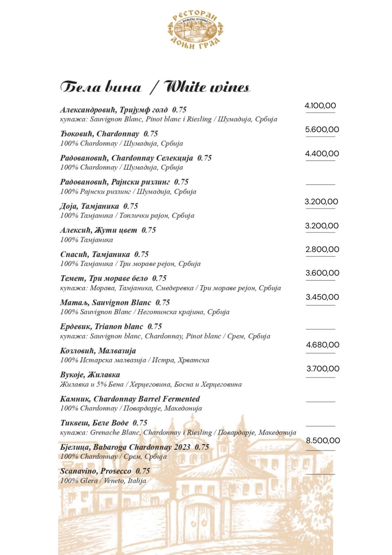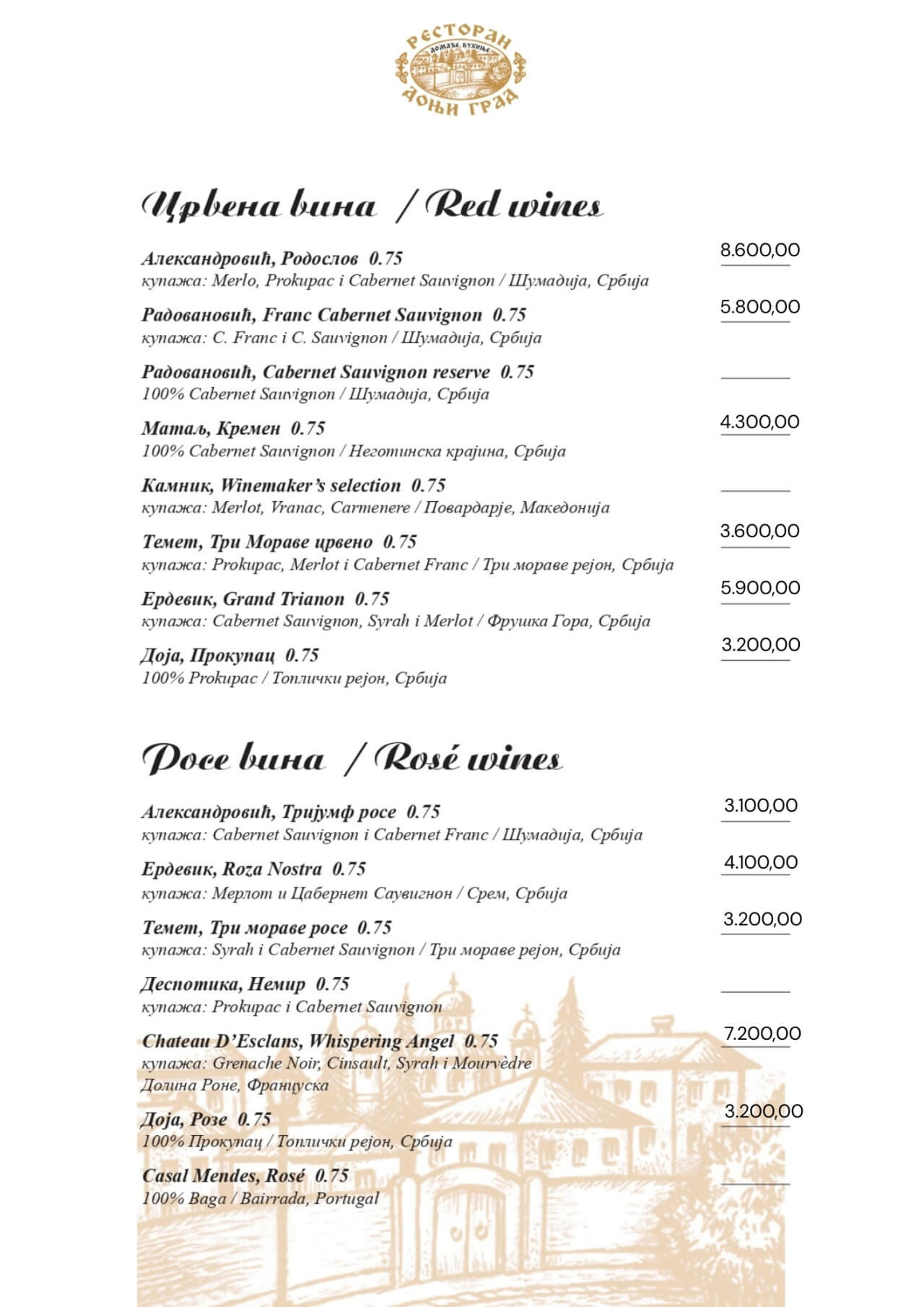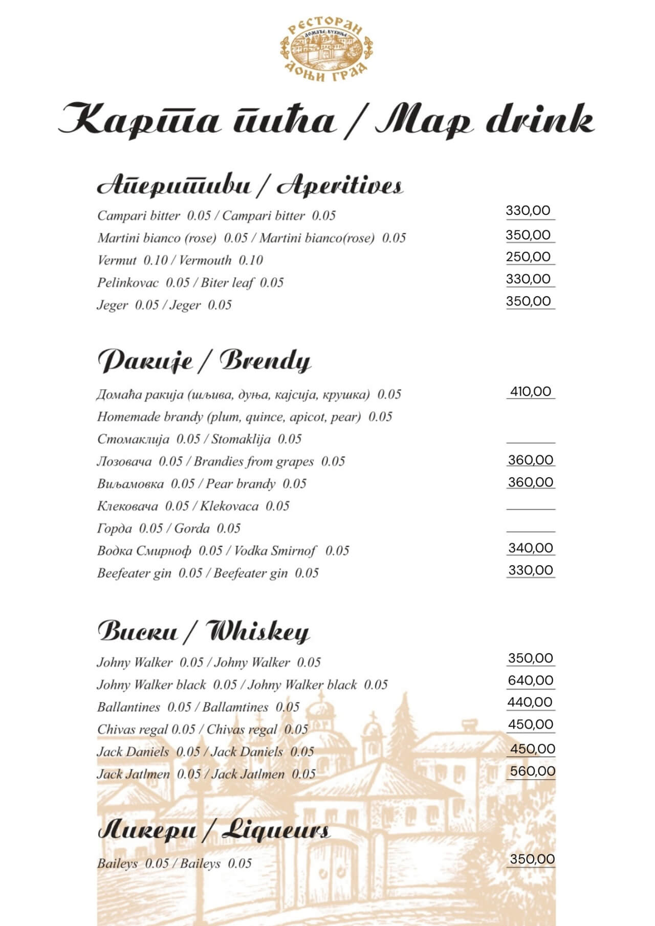 Restoran Donji grad jedno je od onih mesta koja Beograd čine posebnim. Smešten u mirnom delu Dorćola, nedaleko od Kalemegdana, ovaj restoran od 2005. godine spaja duh starog Beograda sa modernim pristupom ugostiteljstvu — stvarajući prostor u kojem se hedonizam i tradicija prirodno prepliću. U Donjem gradu uživaćete u specijalitetima domaće kuhinje pripremljenim po autentičnim receptima: teletini ispod sača, sočnoj jaretini, lozničkoj mućkalici, dimljenoj prasetini, kao i čuvenom bifteku u ulju – jelima zbog kojih se gosti uvek rado vraćaju. Ovde se neguje ukus domaće, tradicionalne kuhinje, ali pripremljen na način koji prati savremene gastronomske standarde.Enterijer od cigle i drveta, topla domaćinska atmosfera i ljubazno osoblje čine Donji grad mestom na kojem se lako osećate kao kod kuće. Letnja bašta pod lipama, koja od proleća do jeseni miriše na pravi beogradski ugođaj, savršena je za jutarnju kafu, opušten ručak ili večeru uz kvalitetno vino.