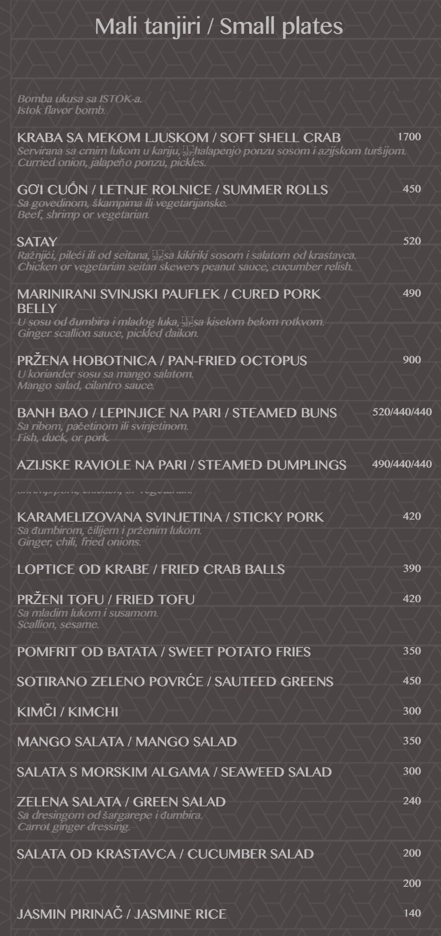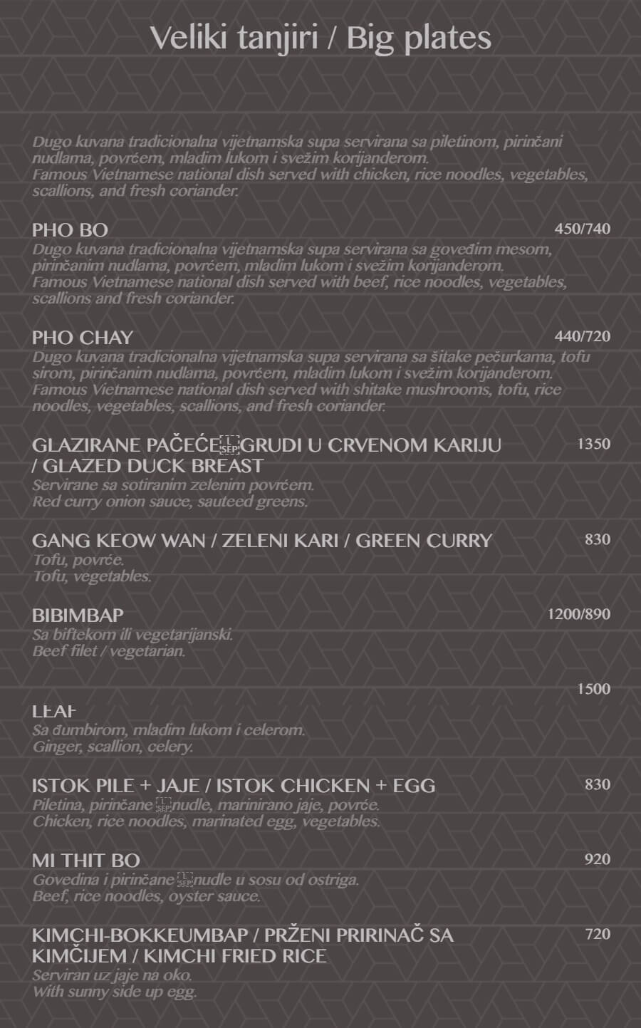 Ljubazno osoblje će vam pomoći da izaberete hranu koja najviše odgovara vašim afinitetima, a u ponudi su različite supe, jela od mesa, morskih plodova i povrća koja su napravljena po receptima iz Vijetnama.
