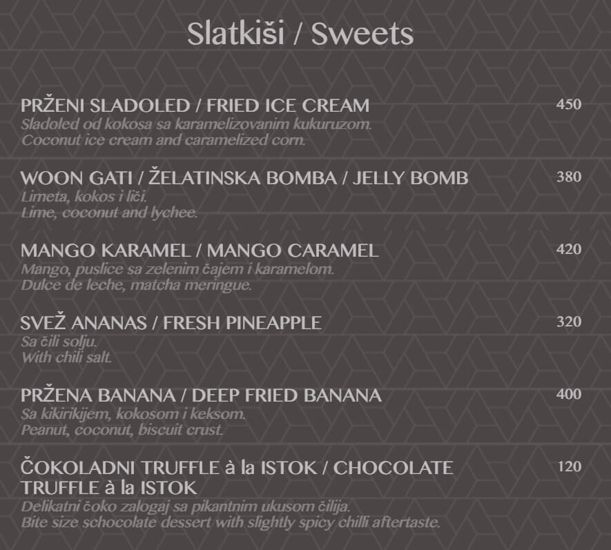 Za dezert možete probati prženi sladoled od kokosa sa karamelizovanim kukuruzom ili prženu bananu sa kikirikijem, kokosom i keksom.