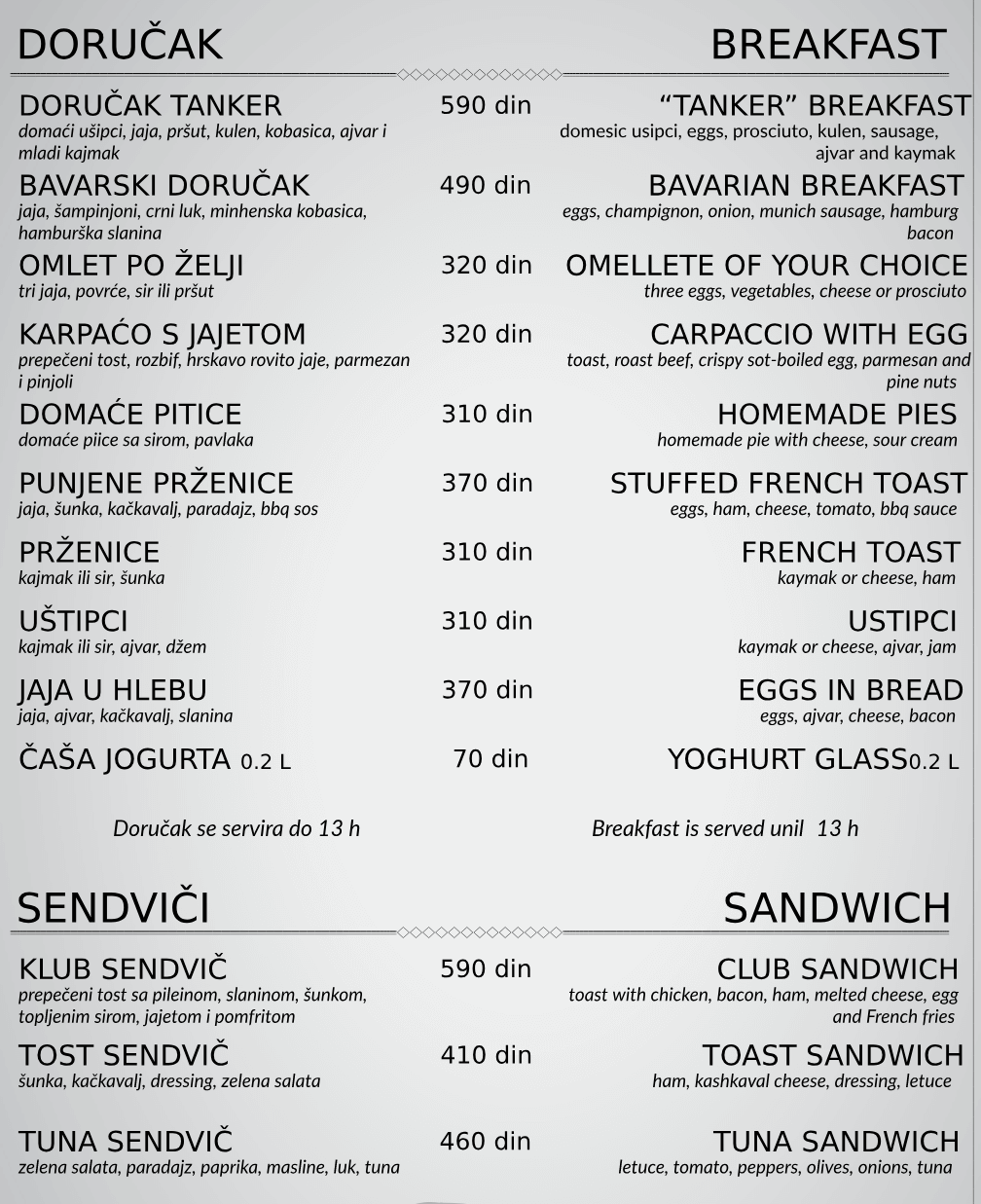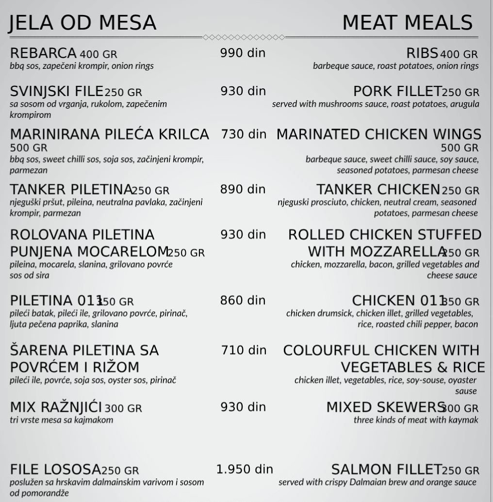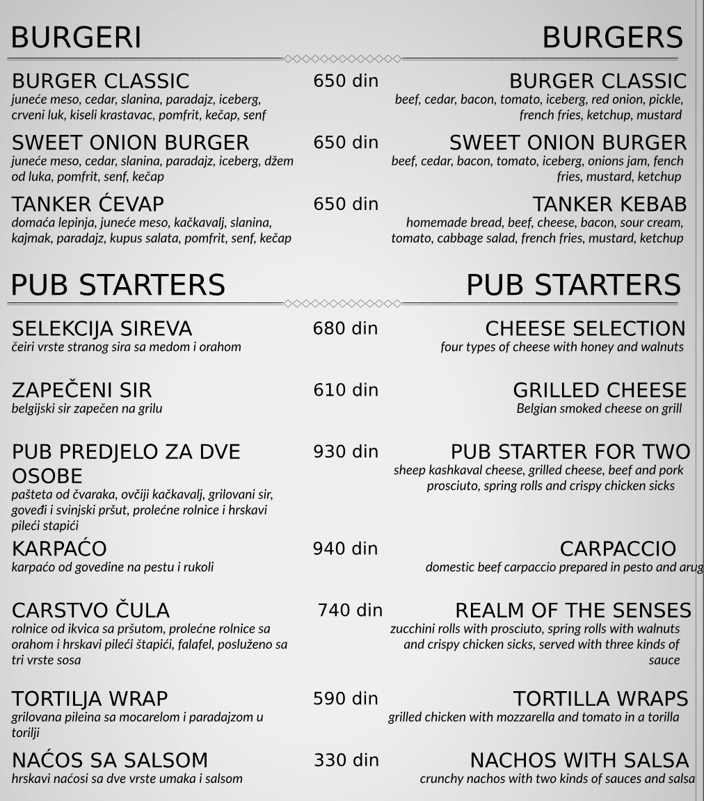 Meni je prvobitno bio baziran na ponudi kakvu imaju barovi, a vremenom je dopunjen tako da zaista ima po nešto da zadovolji svačiji ukus.