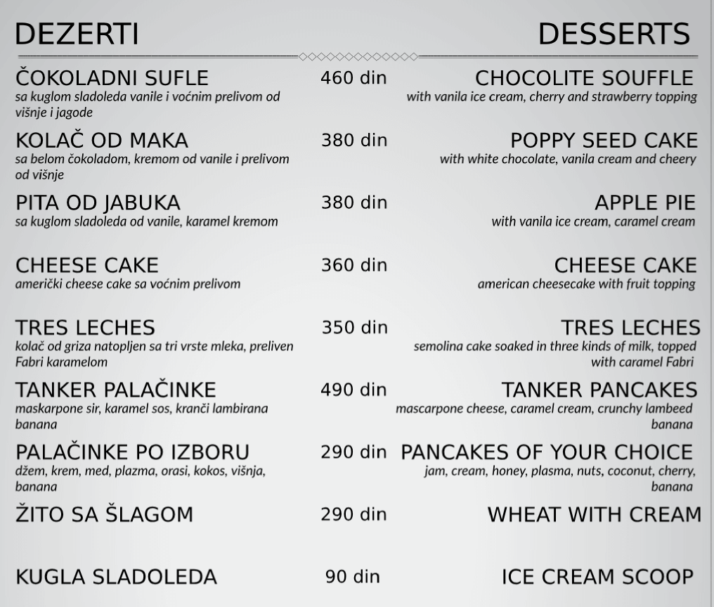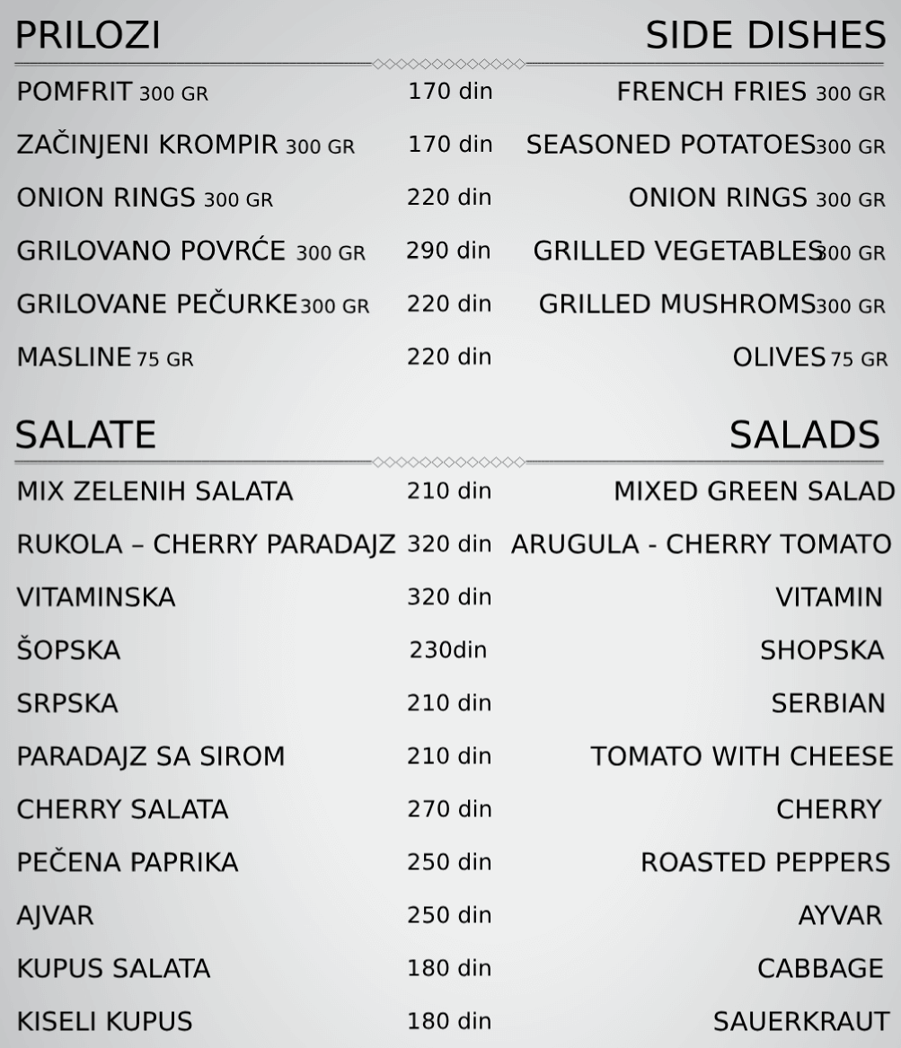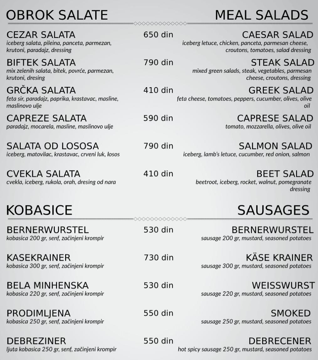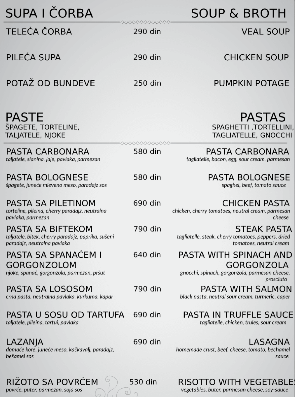 Meni je prvobitno bio baziran na ponudi kakvu imaju barovi, a vremenom je dopunjen tako da zaista ima po nešto da zadovolji svačiji ukus.