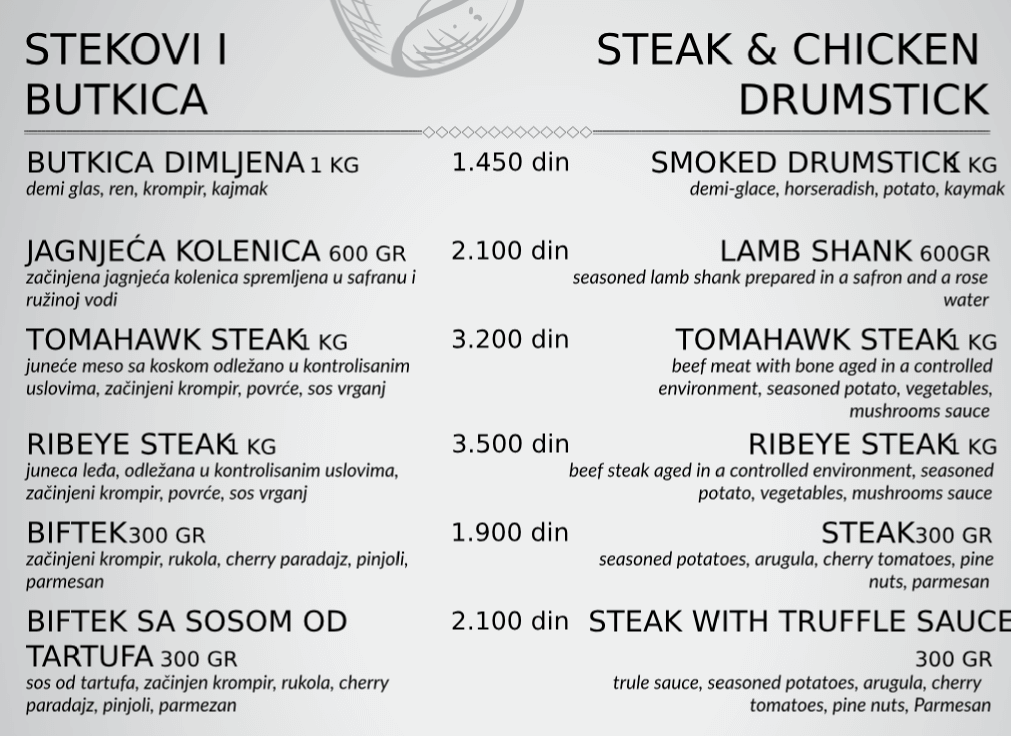 Tako, osim slasnih svinjskih rebarca, pikantnih pilećih krilaca, sočne svinjske butkice, jelovnik sadrži i veliki broj pasti, obrok salata, predjela i slatkih dezerta.